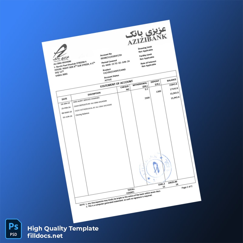 Transform your documentation needs with the Afghanistan Azizi Bank Statement Template available in both Word and PDF formats. Designed for quick edits and professional output, this template is ideal for individuals in need of immediate access to bank statements for various purposes.